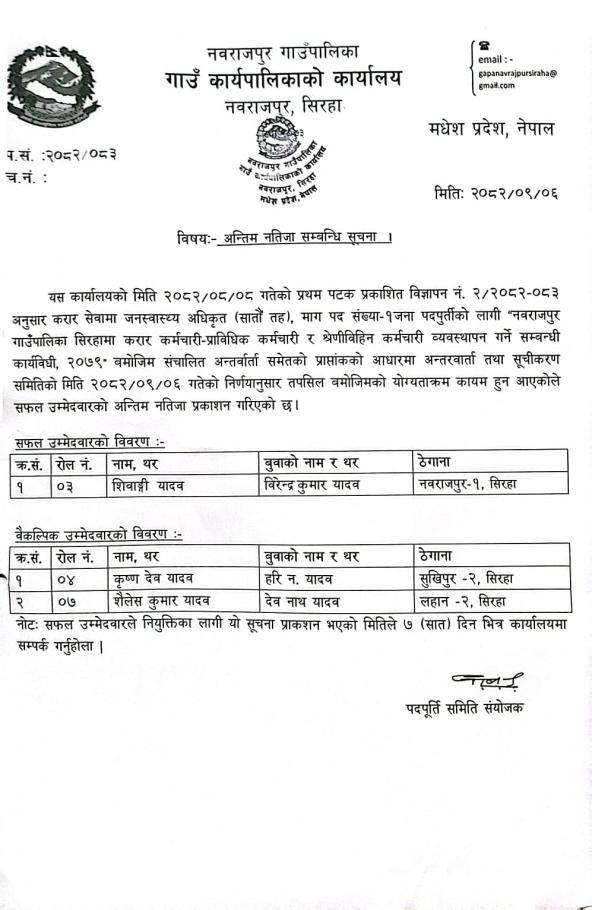 नगर प्रहरीको प्ररम्भिक स्वास्थ्य परिक्षण तथा शारीरिक तन्दुरुस्ती परिक्षणको नतिजा प्रकाशन सम्बन्धी सूचना।