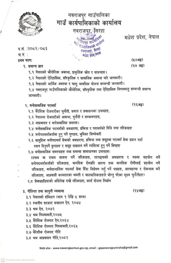 मनोसामाजिक परामर्शकर्ता(सहायक पाँचौं तह) को खुल्ला प्रतियोगितात्मक परीक्षाको पाठ्यक्रम।