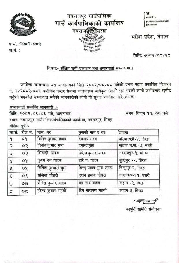 छोटो सूची प्रकाशन तथा अन्तरवार्ता सम्बन्धमा ।