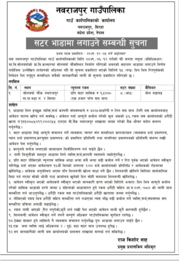 सटर भाडामा लगाउने सम्बन्धी सूचना ।