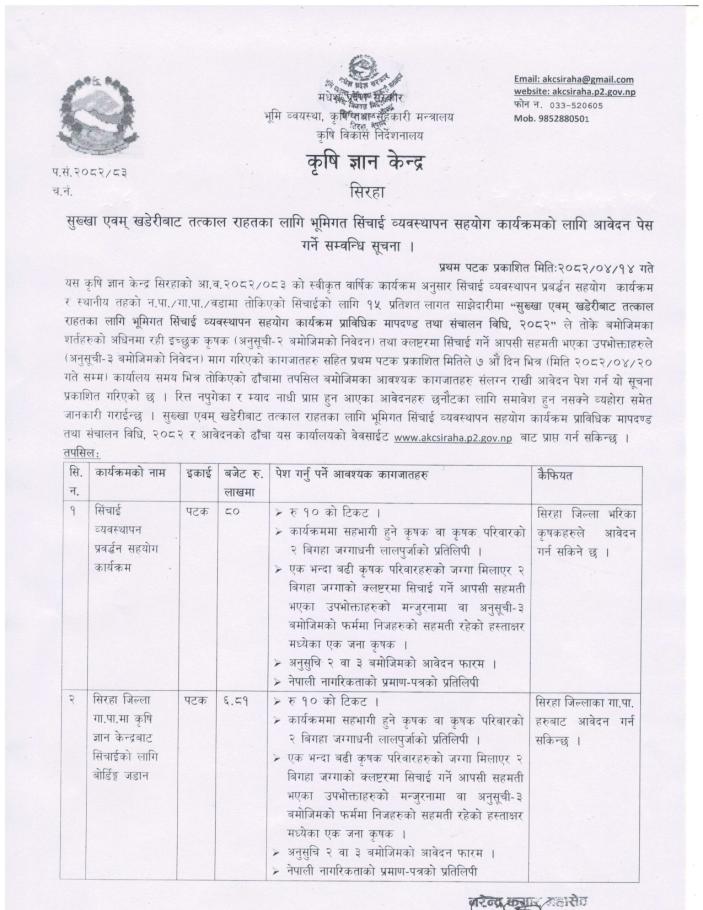 सुख्खा एवम् खडेरीबाट तत्काल राहतका लागि भूमिगत सिंचाई व्यवस्थापन सहयोग कार्यक्रमको लागि आवेदन पेश गर्ने सम्वन्धि सूचना