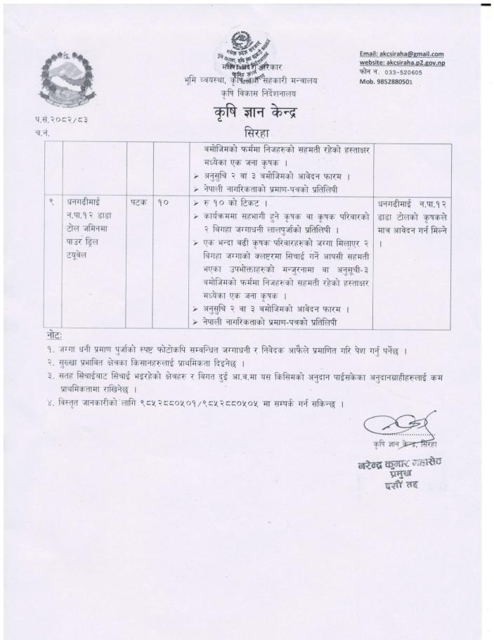 » सुख्खा एवम् खडेरीबाट तत्काल राहतका लागि भूमिगत सिंचाई व्यवस्थापन सहयोग कार्यक्रमको लागि आवेदन पेश गर्ने सम्वन्धि सूचना