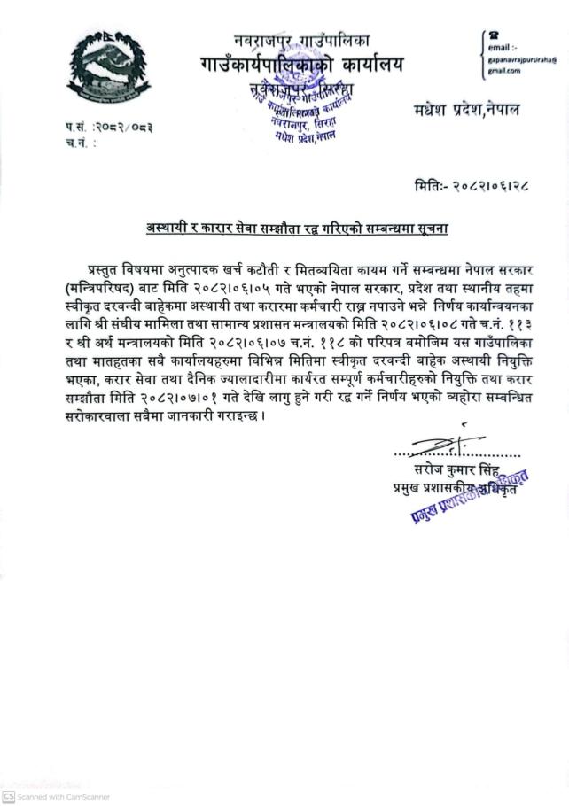 मौसममा सुधार देखियकोले यस नवराजपुर गाउँपालिका अन्तर्गतका सम्पुर्ण विद्यालयहरुमा मिति २०८१/०९/२८ गते आइतवार देखी पठन-पाठन पून सुचारु गर्नु हुन अनुरोध छ।